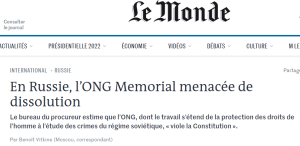 L’intérêt de cette ONG est de présenter la Russie comme un grand camp concentrationnaire, qu’il s’agisse de l’époque soviétique ou actuelle, avec un acharnement digne de plus pur fanatisme. D’une manière générale, Memorial soutient toutes les positions anti-russes, diffusées en Occident : l’agression russe en Ukraine, la répression des minorités sexuelles, la tyrannie politique, etc. C’est manifestement ce qui lui vaut ce soutien ouvert de l’Occident et ce magnifique article dans le journal Le Monde: