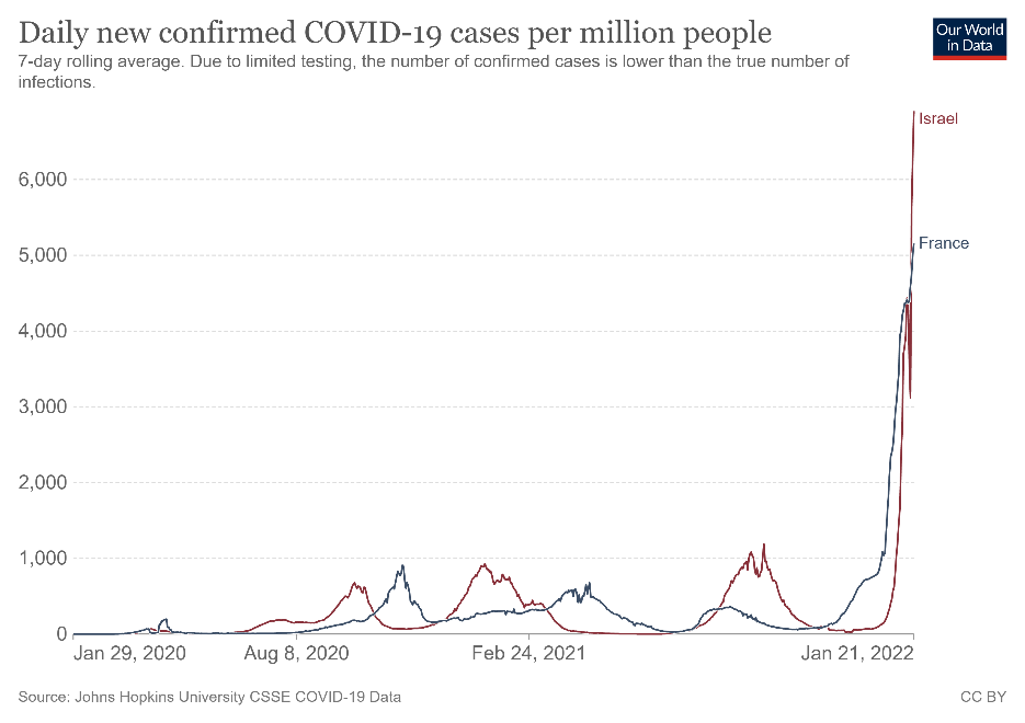 A ce titre les données d’Israël sont tout à fait édifiantes puisque ce pays combine des records de précocité et de couvertures vaccinales (première dose, 2ème dose, 3ème dose « booster », 4ème dose…) avec des données de contamination encore plus élevées que la France.
