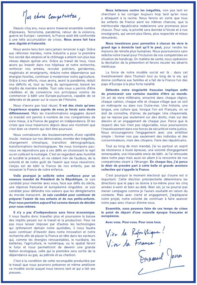 Et ici, le pari de Macron est clair et transparent dans sa lettre : il veut enjamber la campagne, la trivialiser, en faire le moins possible, en espérant que cet évitement permette de limiter le rappel de son bilan désastreux. On peut donc s’attendre à une campagne a minima d’ici le premier tour, d’autant plus que sa qualification ne fait pas de doute, et tant que le second tour semble joué. Encore une fois, Macron évite la mécanique démocratique normale qui consiste pour un dirigeant à rendre des comptes aux corps intermédiaires, pour expliquer son action, et se confronter à la critique. Sa seigneurie semble considérer la mécanique normale de la démocratie comme superflue pour lui, sans doute une énième carcatéristique de son immense complexe de supériorité, tellement apparent depuis qu’il a pris la lumière.