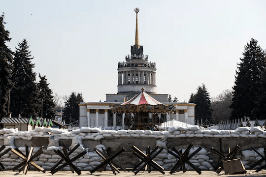 On Monday, Ukrainian forces showed a group of journalists a military fortification in a northern residential neighborhood of the capital, near tall apartment buildings, a subway station and shops. The road was barricaded with lines of tires, concrete blocks, piles of sandbags, sharp metallic objects to stop vehicles and large metal tank traps known as “hedgehogs.”