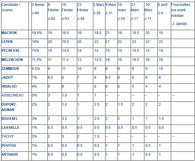 Deux candidats – Jean-Luc Mélenchon et Éric Zemmour – terminent leur campagne en tendance haussière.