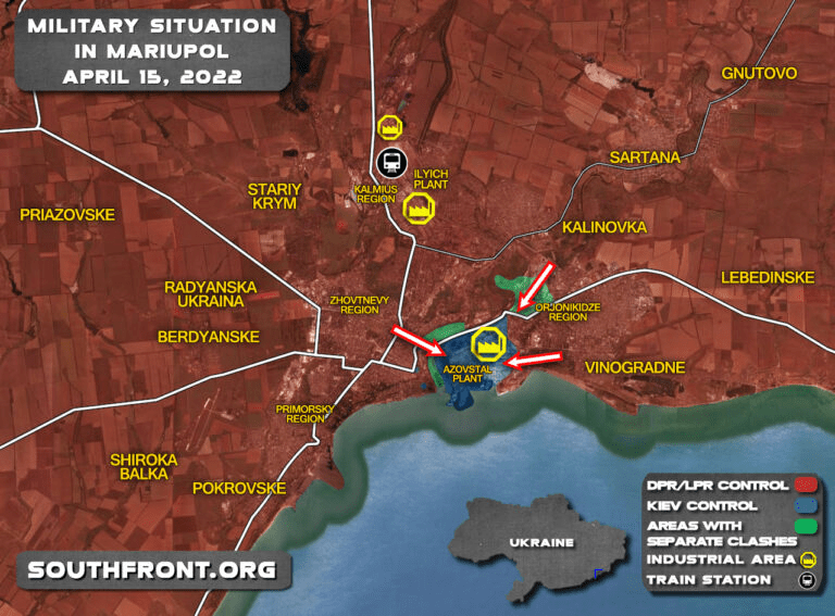 The mop up operations in the city of Mariupol continue. On April 15, the joint Russian and DPR troops claimed another victory. The Russian Ministry of Defence confirmed that Russian and DPR troops took control over the Illich Iron and Steel Plant in the city of Mariupol. It was one of the main hotspots of resistance of the AFU in the city.
