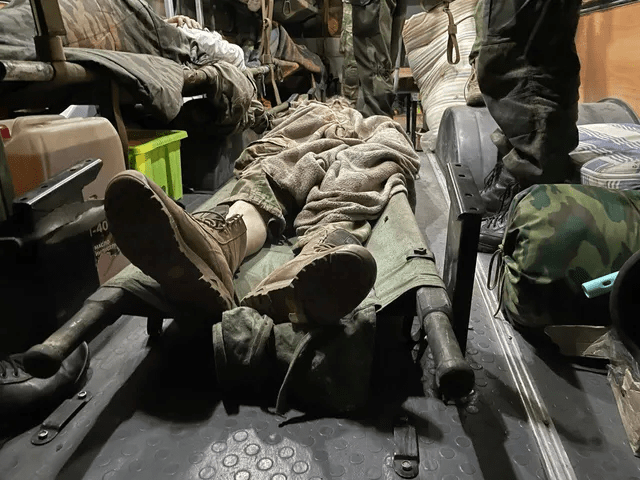 Les minibus se dirigent vers Novoazovsk, où les blessés seront examinés et nourris, et où les plus lourds seront opérés. Nous suivons. Une heure plus tard, les bus sont garés dans la cour de l’hôpital de district local. J’entre dans l’un d’eux. L’odeur âcre des corps non lavés et des blessures en décomposition frappe mon nez. Des soldats ukrainiens sont allongés sur des brancards, sur trois niveaux. Ils ont l’air misérables : maigres, pâles, sales, tachés, enveloppés dans des bandages dégoûtants. La peur s’est figée dans leurs yeux.