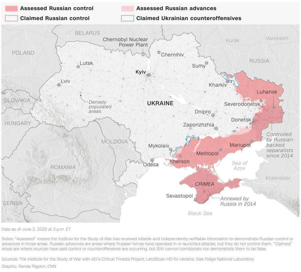 The map below (June 2, 2022) indicates the areas of deployment and Russian control from the North of Lugansk (territories opposite Kharkov) to Kherson on the Dnieper.