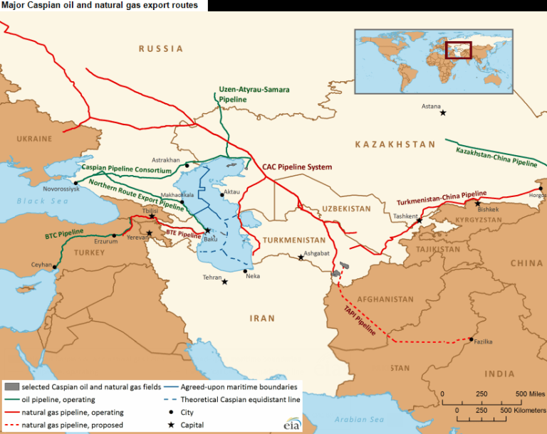 While the main strategic oil pipeline route is between Novorossiysk and Baku, there is a nexus of gas pipelines between Russia, Kazakhstan, Iran, Turkmenistan, linking up with China.