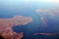 image right: Kerch strait, photo taken from Crimean side, (prior to the construction of the bridge) narrow width, aerial view of strait and Taman peninsula.