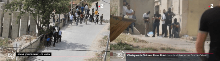 Deux jours après, le 13 mai, second sujet à l’occasion des obsèques de la journaliste. Verdict ? C’est pire ! La présentation du sujet, qui fait partie des « grands titres » annoncés lors de l’ouverture du JT présenté ce jour-là par Laurent Delahousse, est un concentré de désinformation par omission : « Tensions et violences aujourd’hui lors des obsèques de la journaliste d’Al Jazeera, tuée par balle en Cisjordanie. Plusieurs milliers de Palestiniens lui ont rendu hommage à Jérusalem. » Violences lors des obsèques, certes, mais infligées par qui ? Tuée par balle, oui, mais tirée par qui ?
