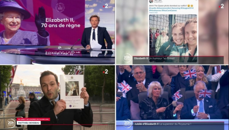 Le 29 mai, jour de « la marche des drapeaux », le « 20h » consacrait déjà 3 minutes et 14 secondes à « l’humour « so British » d’Élizabeth II », par anticipation de la « journée spéciale Jubilé » organisée avec Stéphane Bern quatre jours plus tard (2/06) ayant monopolisé… près de 5h de direct ! Alors on souhaite un bon jubilé en retard à toute la rédaction, et à bientôt pour les nouveaux gros titres sur l’« escalade de violences » en Palestine.