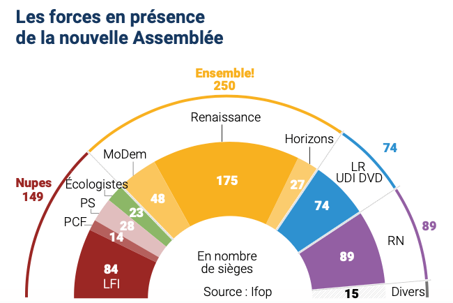 Bien sûr, la majorité présidentielle reste le premier bloc de l’Assemblée, mais elle perd une centaine de députés, et échoue à plus de 40 sièges de la majorité absolue. La sanction est claire pour le président réélu, le premier qui ne voit pas confirmer son mandat lors des législatives qui ont suivi. Son style si jupitérien a rebuté une grande majorité de Français qui ne souhaitaient pas lui confier une nouvelle majorité absolue,. C’est sans doute cette volonté de priver Macron d’une majorité absolue qui a motivé bien beaucoup de Français dans des circonsciptions serrées et permis la défaite du président de l’Assemblée, Richard Ferrand, du président du groupe LREM, Christophe Castaner, et de trois ministres (Amélie de Montchalin, Brigitte Bourguignon et Justine Bénin) après l’élimination de Jean-Michel Blanquer, trois autres (Clément Beaune, Stanislas Guérini et Elisabeth Borne) échappant de peu au couperet.