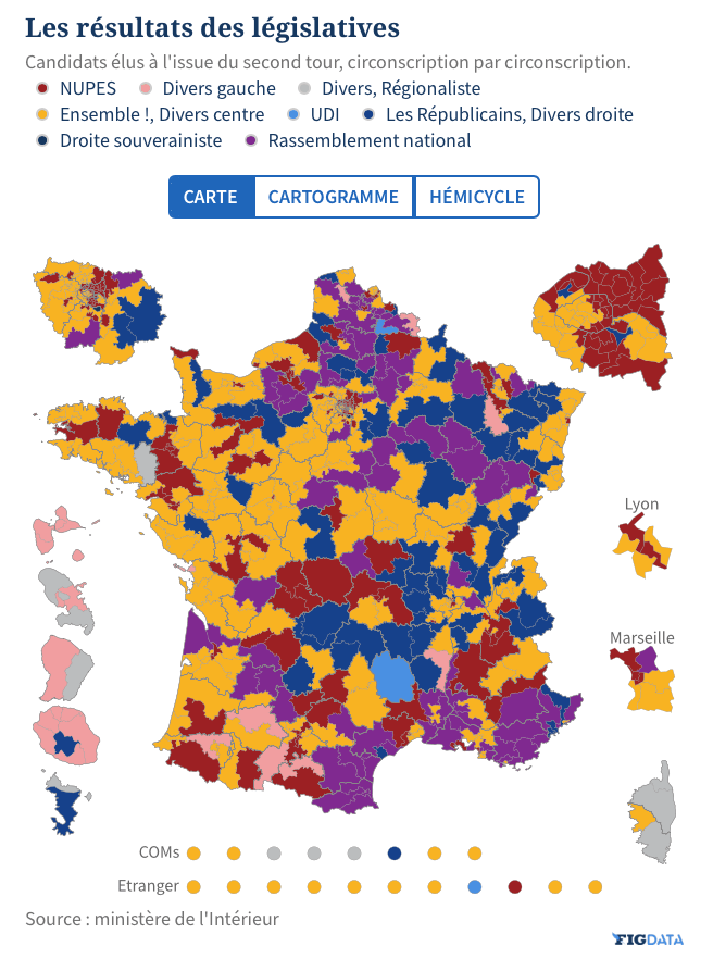 La géographie du vote est extraordinairement intéressante et reflète la grande justesse des analyses de Christophe Guilluy. Les élus des grandes métropoles et de leur périphérie immédiate sont quasi exclusivement issus de la majorité présidentielle, ou de la NUPES, la première récupérant les sièges autrefois détenus par la droite (l’Ouest parisien par exemple). LR a littérallement été expulsé des grandes métropoles, les quartiers chics se choisissant quasi uniformément des représentants de la majorité présidentielle (ce qui a sauvé Clément Beaune, heureusement positionné dans le 7ème arrondissement de Paris, gagné sur le fil). Le vote Macron est un vote de personnes plutôt âgées et riches vivant dans des environnements plutôt dynamiques et privilégiés. Ce faisant, LR finit par devenir le représentant modéré de la France périphérique, dont le RN est le premier choix. La France privée de service public vote à droite.