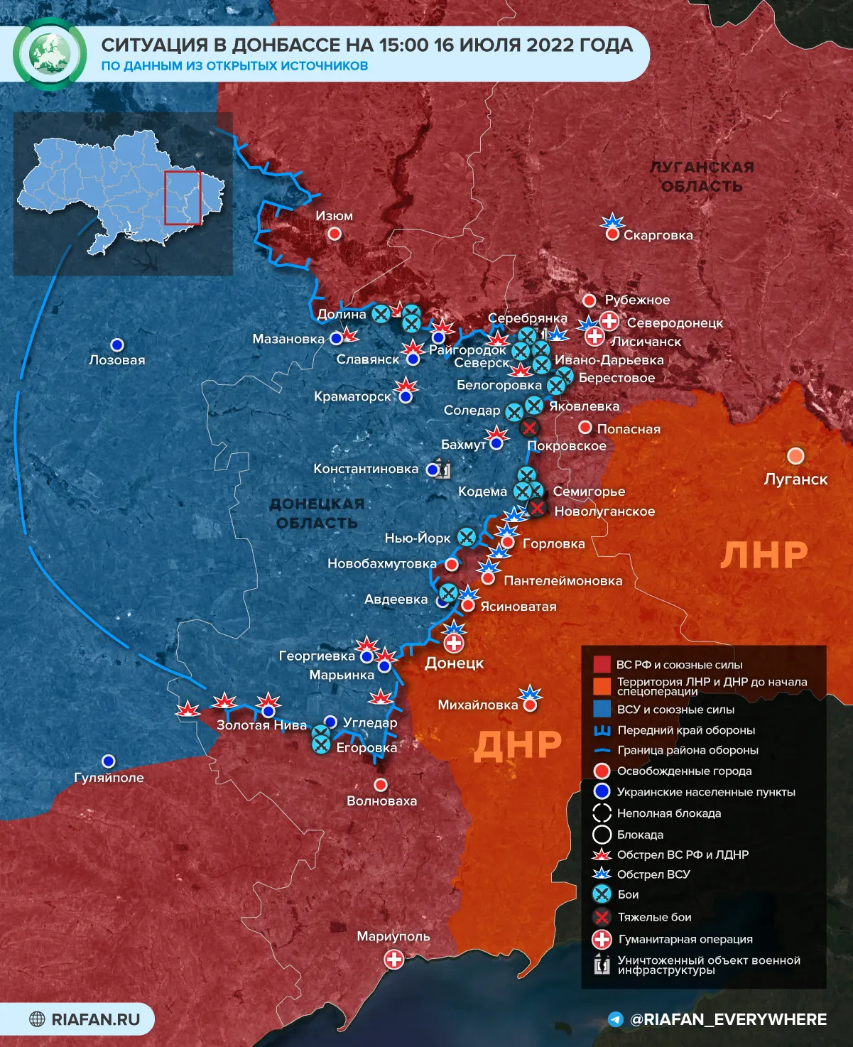 Depuis le début de la journée du 16 juillet, les formations armées ukrainiennes ont ouvert le feu en direction de Donetsk, ainsi que de Dokuchayevsk, Makeyevka, Dolomitne, Horlivka, Holmivskyy, Panteleimonivka, Aleksandrovka, Yasynuvata, Mikhailovka et Ozeryanovka. Quatre civils ont été tués et cinq autres blessés à la suite des bombardements à Donetsk. La JCCC fait état de blessés civils à Dokuchaievsk.