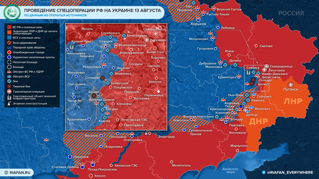 Dans la nuit et la matinée du 13 août, les forces ukrainiennes ont ouvert le feu en direction de Donetsk, ainsi que des localités de Horlivka, Makiivka, Olenivka et Zaitseve Yuzhnoye. À Horlivka, un marché de gros a été touché. Les autorités locales font état de quatre victimes.