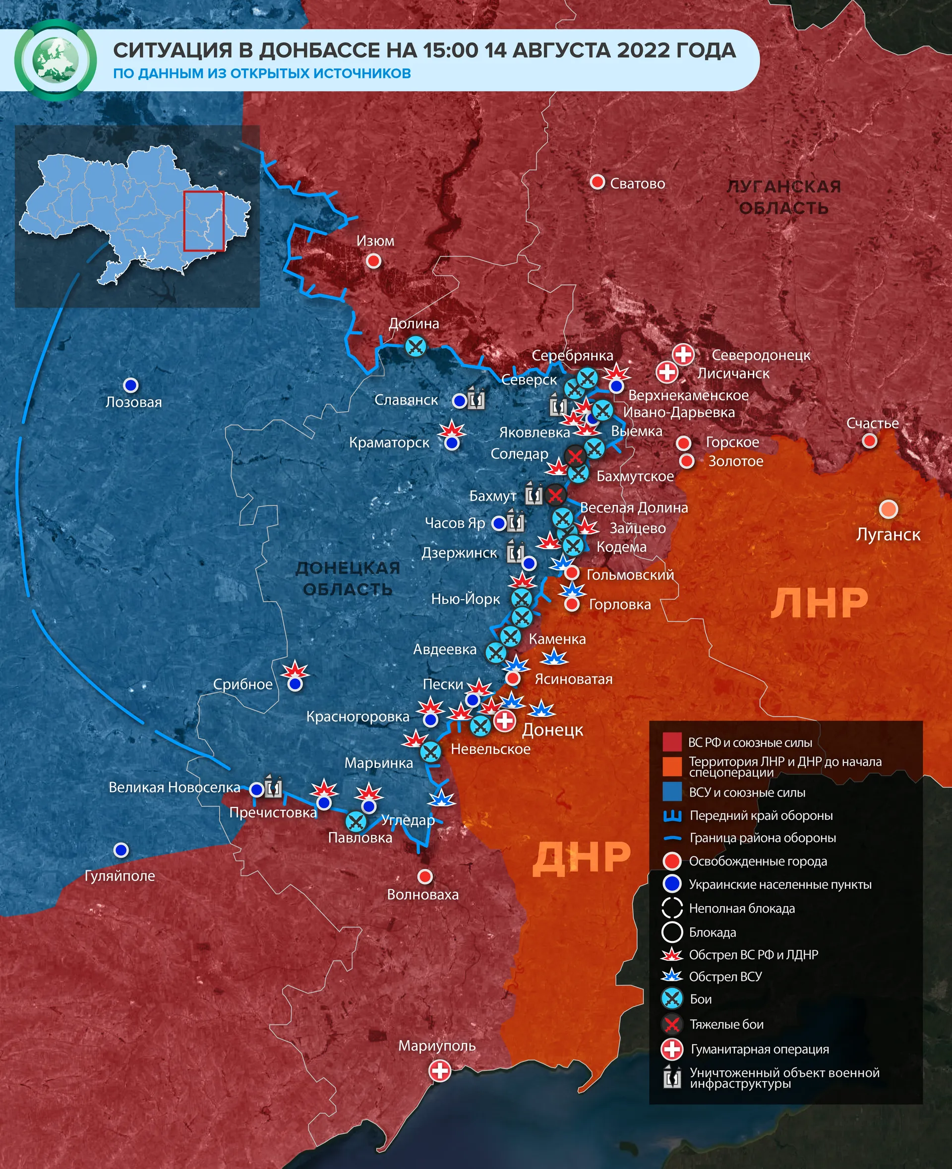 Depuis le début de la journée du 14 août, les formations armées ukrainiennes ont ouvert le feu en direction de Donetsk, ainsi que de Yasynuvata, Makeyevka, Horlivka, Holmivskyi, Olenivka, Staromykhailivka, Zaitseve South, Panteleymonivka et Dokuchaievsk.