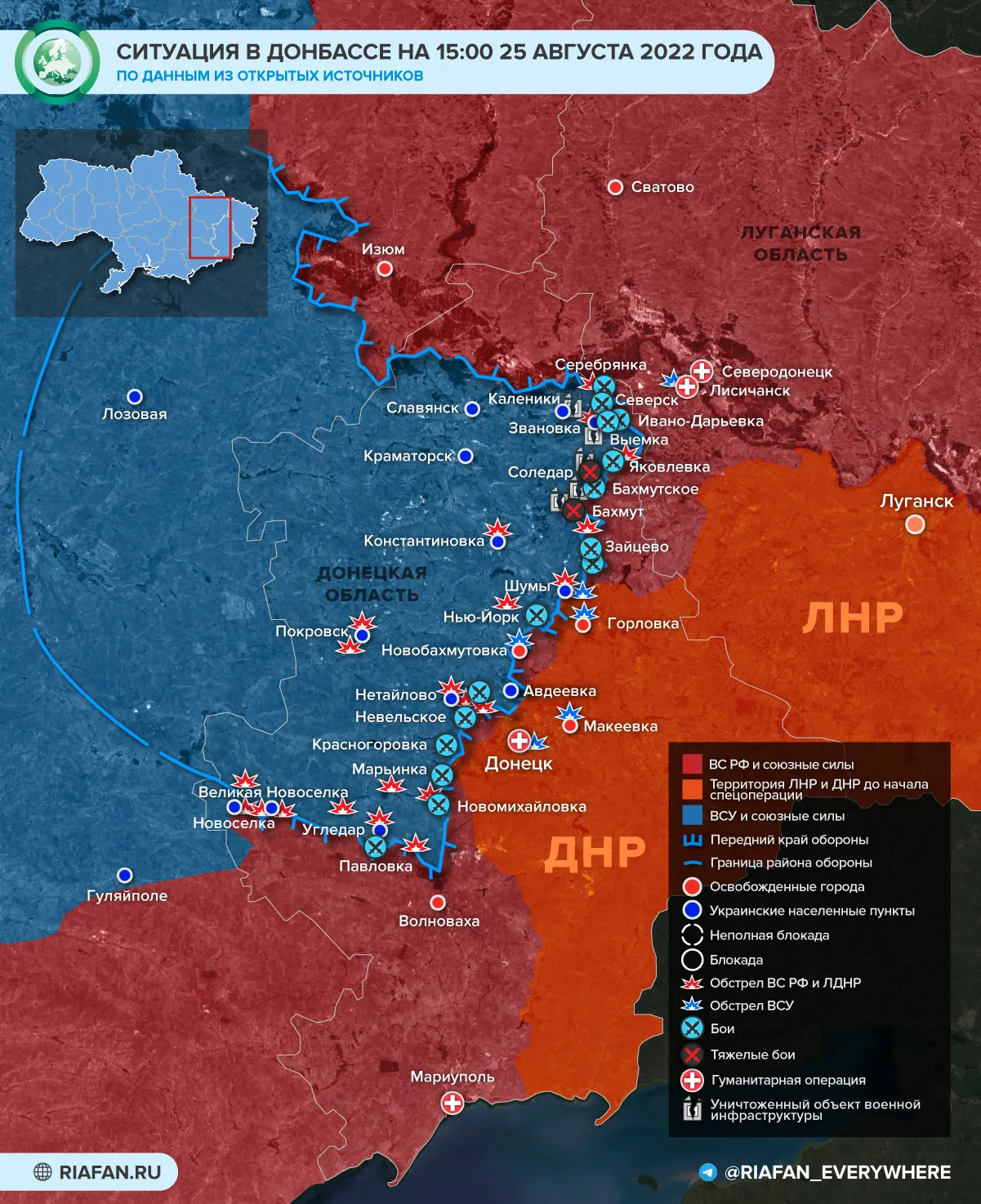 Depuis le début de la journée du 25 août, les forces armées ukrainiennes ont ouvert le feu en direction de Lysychansk en utilisant des HIMARS MLRS. Selon les rapports préliminaires, cinq garages et deux dépendances ont été endommagés.