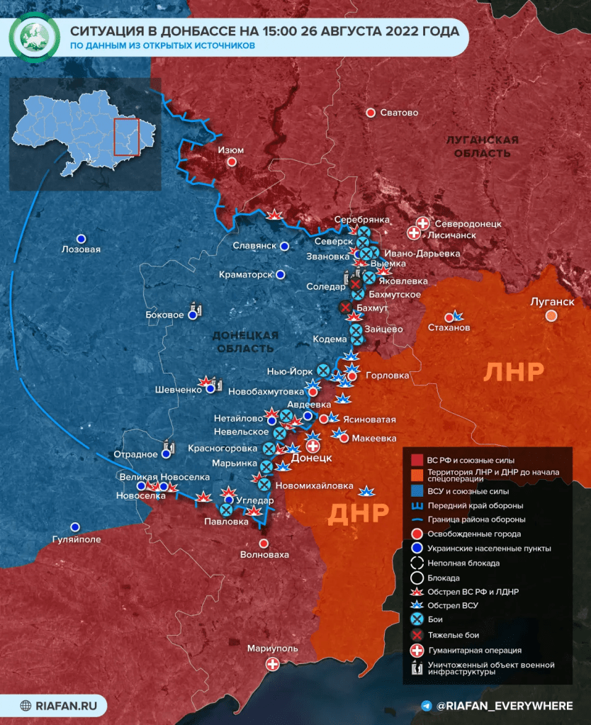 Depuis le début de la journée du 26 août, les forces armées ukrainiennes ont ouvert le feu en direction de Donetsk, ainsi que de Mikhailovka, Horlivka, Yasynuvata, Shiroka Balka, Ozeryanovka, Zaitseve, Novobakhmutovka, Panteleimonovka, Makeyevka, Aleksandrovka et Staromikhailovka.