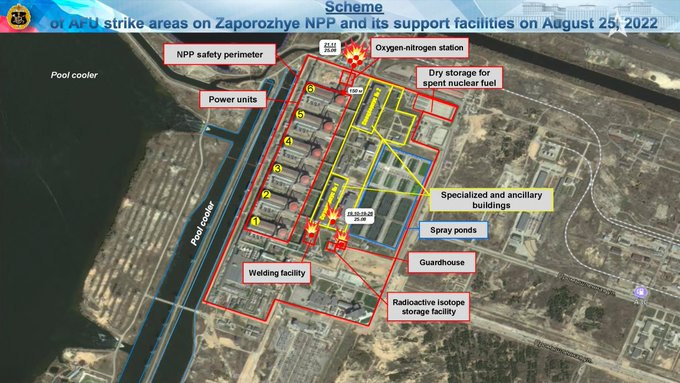 La veille, l’APU a tiré à trois reprises sur la centrale nucléaire de Zaporozhye. Au total, 17 obus ont été tirés, dont 4 ont touché le toit du bâtiment spécial n° 1, où sont stockés 168 assemblages de combustible nucléaire américain WestingHouse. Dix autres obus ont explosé à 30 mètres de l’installation de stockage à sec du combustible nucléaire usé et trois autres ont explosé près du bâtiment spécial n° 2, qui abrite l’unité de stockage du combustible nucléaire neuf de TVEL et l’installation de stockage des déchets radioactifs solides.