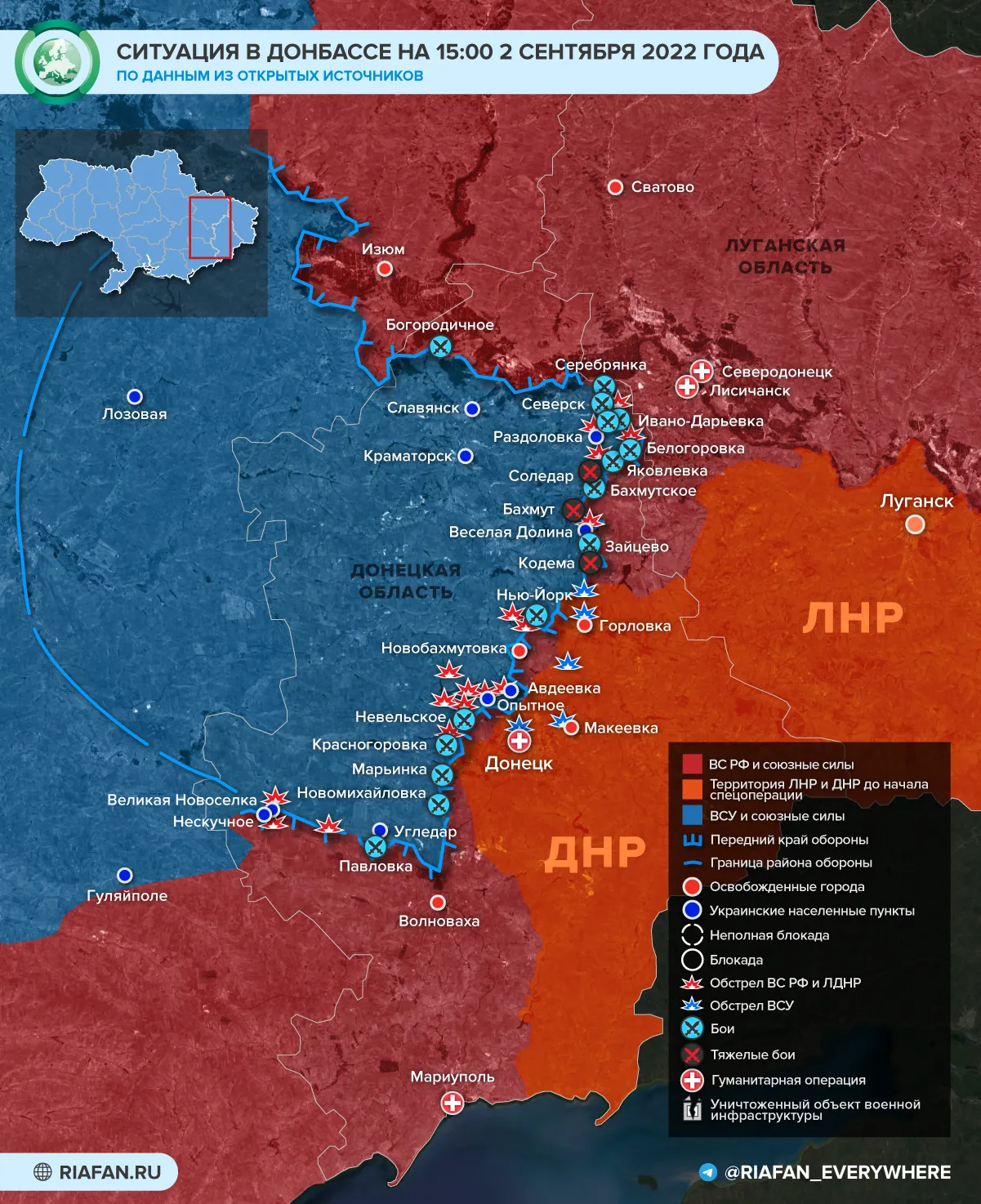 Denys Pushylin, chef du DNR, a déclaré que la tâche des forces alliées était de libérer toutes les villes russes qui avaient été fondées par des Russes. Il a qualifié les événements actuels de « temps historique », notant que les habitants de la Fédération de Russie, comme ceux du Donbass, n’étudient pas l’histoire, mais l’écrivent.