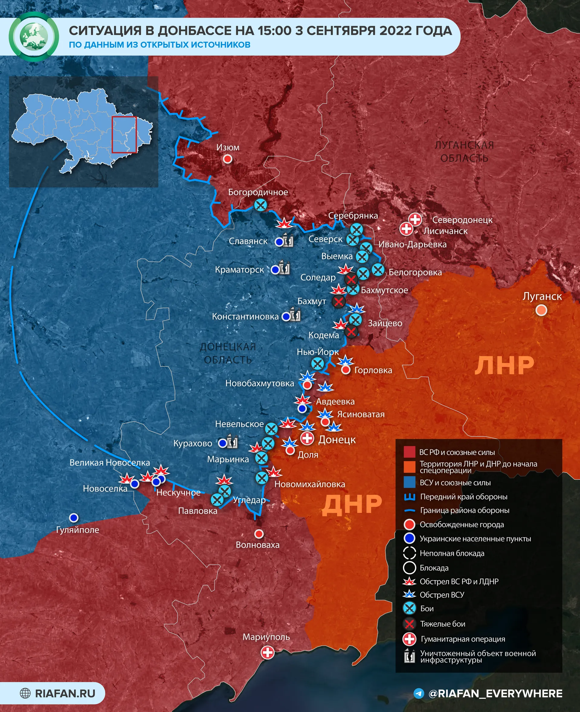 Depuis le début de la journée du 3 septembre, les forces armées ukrainiennes ont bombardé Donetsk, ainsi que Makiivka, Novobakhmutovka, Panteleymonovka, Horlivka, Dolya, Zaitseve et Yasynuvata. Un civil a été blessé à la suite de la frappe sur Donetsk, et on signale également des dommages aux bâtiments résidentiels et aux lignes électriques.