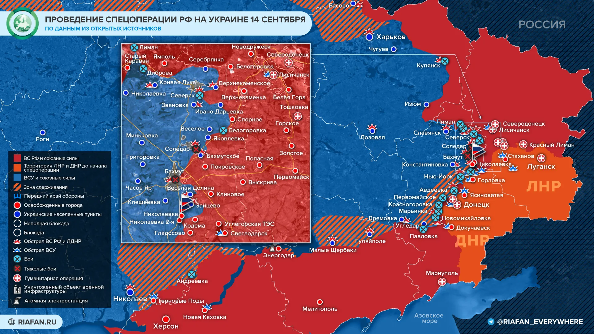 Le chef du gouvernement régional, Serhiy Yeliseyev, a déclaré que les frontières de la région de Kherson étaient protégées de manière fiable par les forces armées russes, et que toute tentative d’avancée des forces de sécurité ukrainiennes serait empêchée. Il a également informé que les forces armées ukrainiennes avaient lancé une autre attaque de missiles sur le passage de ferry près du pont Antonivskyy dans la matinée du 14 septembre.