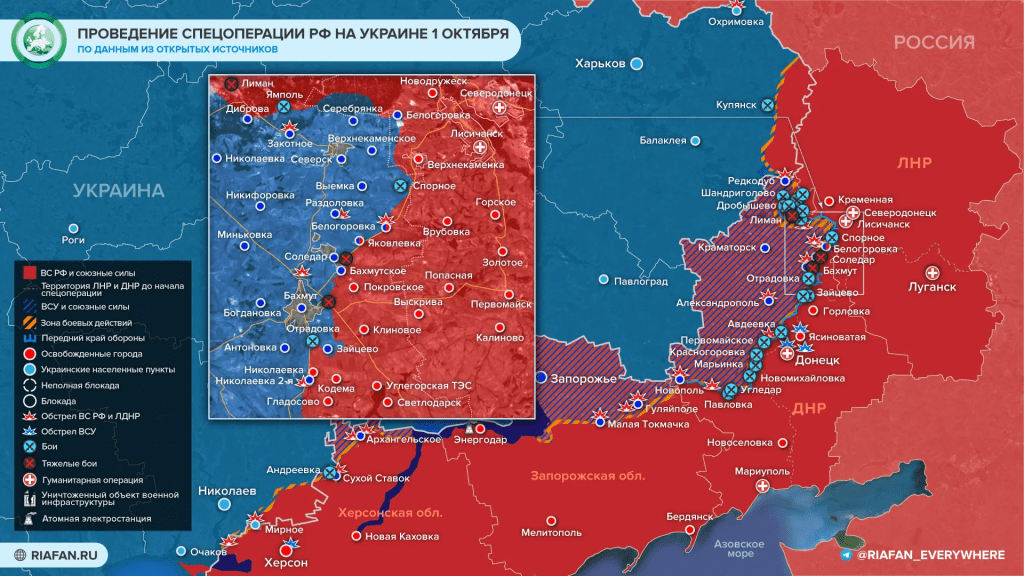 La défense de Liman continue. Des rapports font état de tentatives de groupes des forces armées ukrainiennes de pénétrer dans la ville dans les champs avec des véhicules légèrement blindés, tentatives qui sont réprimées par l’armée russe. On signale également que des unités ukrainiennes sont amenées à Liman depuis les environs de Seversk et Soledar, ainsi que des réserves de Sloviansk et Kramatorsk.