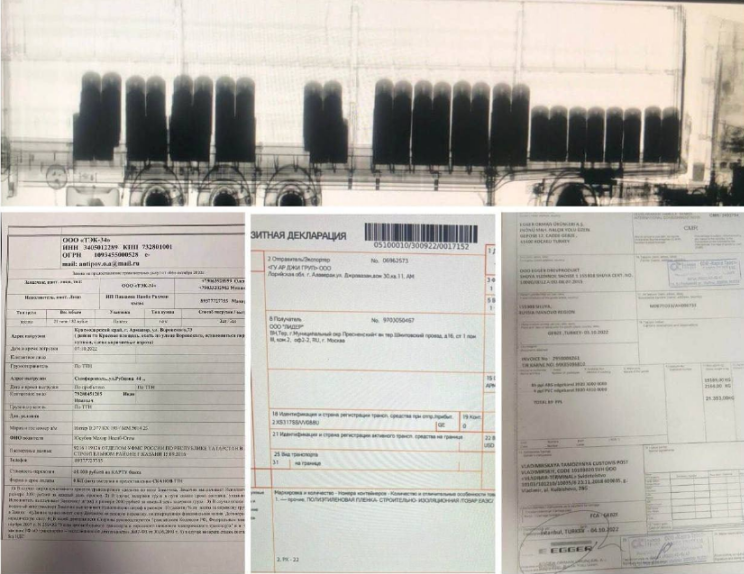 « Les citoyens ukrainiens Mikhail Vladimirovich Tsyurkalo, né en 1975, Denis Olegovich Kovach, né en 1979, Roman Ivanovich Solomko, né en 1971 ; les citoyens géorgiens Inosaridze Sandro, un courtier nommé Levan, et un citoyen arménien Arthur Terchanyan, né en 1985, ont été impliqués dans l’organisation du transport de marchandises de la Bulgarie vers le port de Poti (Géorgie), puis vers l’Arménie. Du 29 septembre au 3 octobre 2022, à Erevan, au terminal Transalliance, la cargaison a été dédouanée selon les règles de la CEE [Commission économique eurasienne] et des documents ont été substitués, après quoi son nouvel expéditeur est devenu GU AR JI GROUP LLC (République d’Arménie, ville d’Alaverdi), et le destinataire enregistré est devenu Leader LLC (ville de Moscou), selon le rapport du FSB.