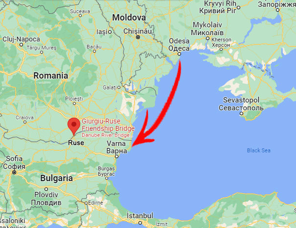 La ville bulgare de Ruse n’est pas située sur la mer Noire, mais sur la rive bulgare du Danube, à l’intérieur du pays. Par conséquent, le navire, qui a quitté Odessa pour Ruse, s’est déplacé sur un parcours côtier le long du bord de mer, puis est entré dans le Danube. Il n’a donc pas fait l’objet d’une vérification par les observateurs turcs dans le cadre du « marché aux céréales ».