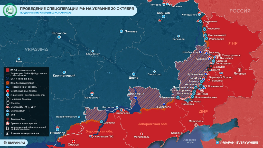 Depuis le début de la journée du 20 octobre, les forces armées ukrainiennes ont ouvert le feu sur Lysychansk ainsi que sur Chervonyi Prapor. Dans les deux cas, des MLRS HIMARS ont été utilisés.