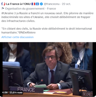 La France accuse la Russie non pas de toucher des cibles civiles, ce qui malheureusement arrive toujours lors d’un conflit, mais de cibler volontairement des sites civils. La France, sans la moindre preuve et se soumettant docilement au narratif ukrainien, accuse donc publiquement la Russie de commettre des crimes de guerre. Voir une grande Nation s’abaisser à une telle servilité est dérangeant …