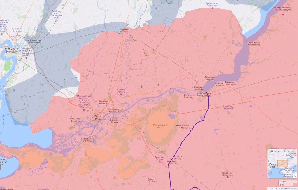D’un point de vue militaire, il y a peu de chances de résister à une attaque sérieuse dans la région, car le réapprovisionnement à travers le Dniepr est très difficile et ne peut être garanti. De plus, l’éventuelle rupture des barrages du Dniepr rendrait tout réapprovisionnement impossible pendant au moins une semaine, voire plus. Cela laisserait suffisamment de temps aux Ukrainiens pour massacrer les troupes russes restées sur place.