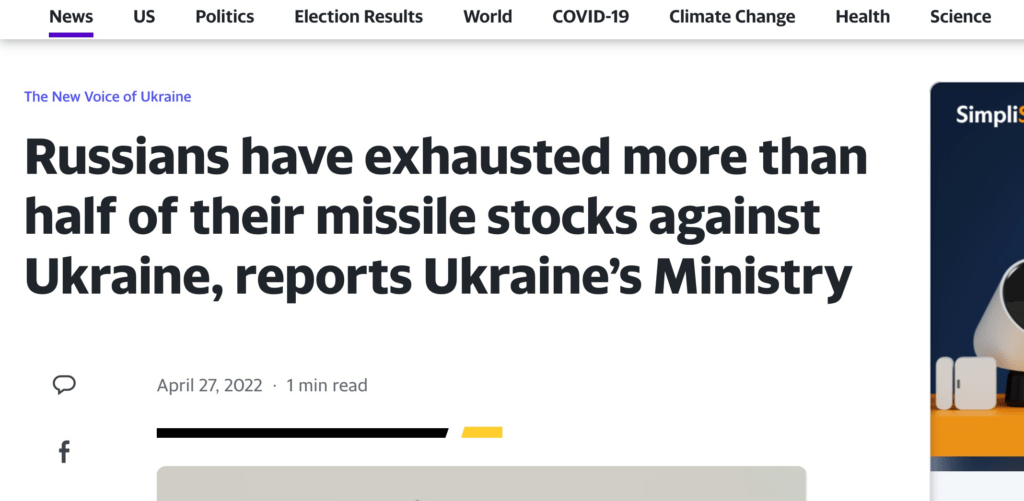 Si vous suivez ce qui se passe, je pense que vous êtes en train de découvrir un thème : les responsables ukrainiens insistent avec confiance sur le fait que la Russie s’est épuisée et les analystes occidentaux crédules, les experts, les politiciens et les journalistes régurgitent ces absurdités. Jetez un coup d’œil au 27 avril 2022 :