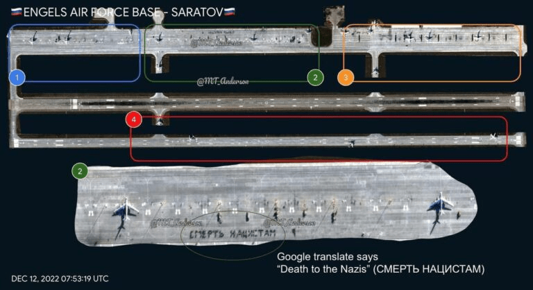 L’armée russe a affirmé que les attaques ont été menées avec le soutien des moyens de reconnaissance des États-Unis et de l’OTAN. Peu après l’attaque, les militaires russes ont envoyé un message aux satellites ennemis, écrivant « Mort aux nazis » sur l’aérodrome. LIEN