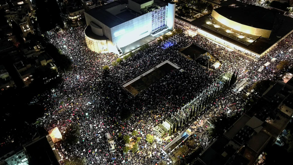 Vers 21 h, la place Habima dans le centre de Tel-Aviv était pleine et la foule débordait dans les rues adjacentes, selon des journalistes de l’Agence France-Presse (AFP) sur place.
