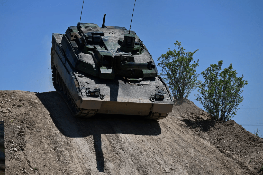 Conçu par Kraus-Maffei et mis en service en 1979 pour remplacer les Leopard 1 et les M48 Patton américains qui équipaient jusque-là l’armée ouest-allemande, le Leopard 2 a été produit à environ 3 500 exemplaires. Il équipe une douzaine de nations européennes, dont la Grèce et l’Espagne. Un moteur de 1 500 chevaux permet de pousser ses 60 tonnes à 70 km/h. Ce char de 7,72 mètres de long dispose d’une autonomie de 550 kilomètres.