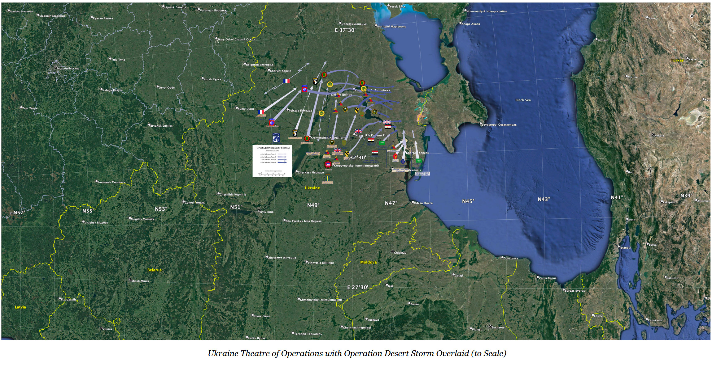 Voici une carte opérationnelle de l’opération Tempête du désert, superposée en échelle à la carte de l’Ukraine.