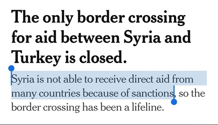 L'humanitarisme sélectif occidental, ltremblement de terre, NYT, sanctions américaines, Syrie