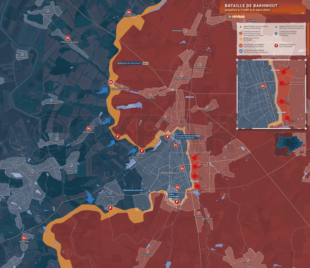 ▪️ près de Bogdanivka, Krasnoye et Khromovo, les unitĂ©s d’assaut ukrainiennes continuent de tenter une contre-attaque pour prĂ©server le corridor terrestre de Bakhmut Ă Chasov Yar et Konstantinivka.