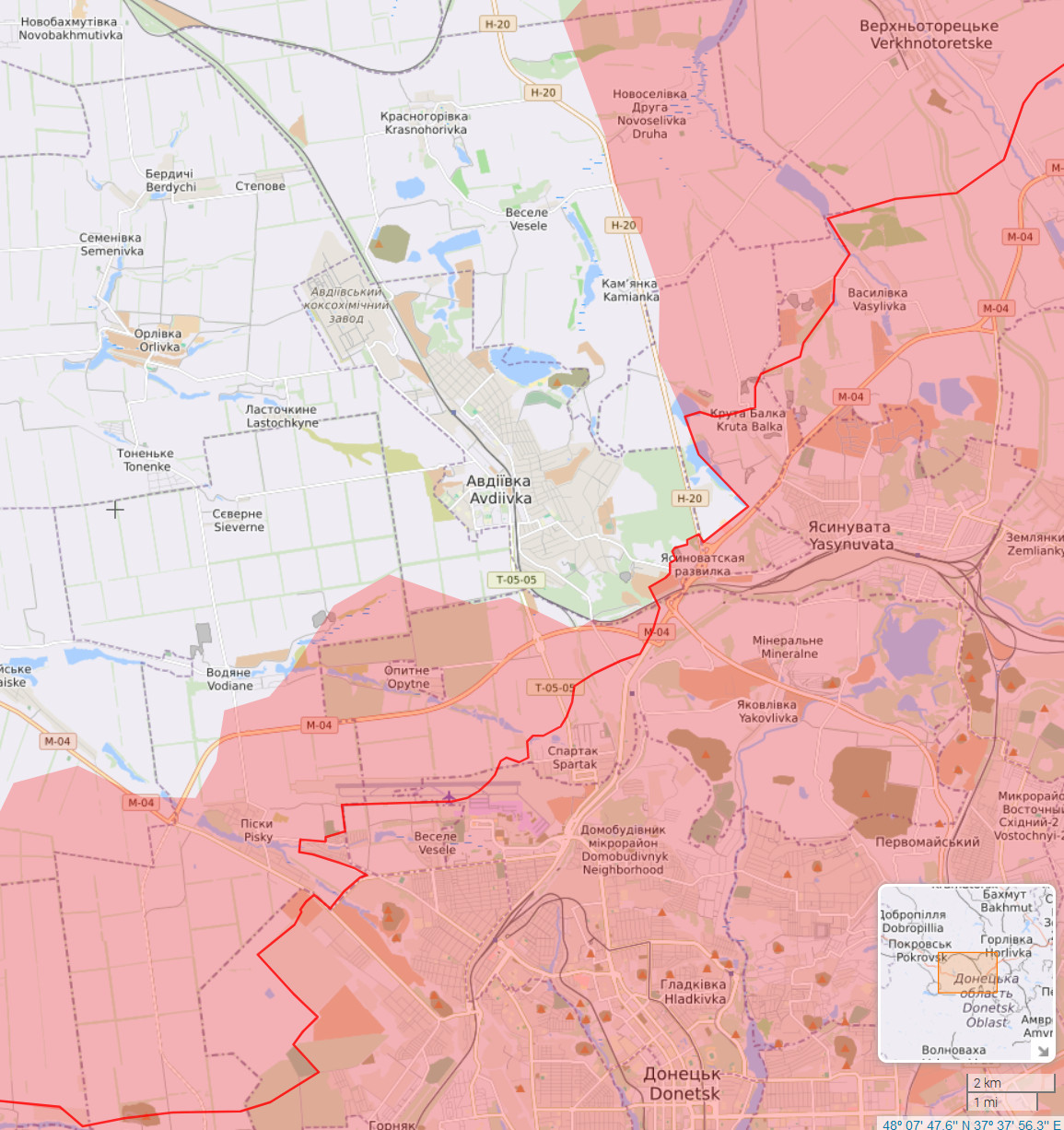 La distance entre les positions russes au sud-ouest et au nord-ouest d’Avdiivka est de 8 kilomètres. Cette distance est suffisamment étroite pour permettre à l’artillerie russe d’interdire la circulation routière dans la zone intermédiaire.