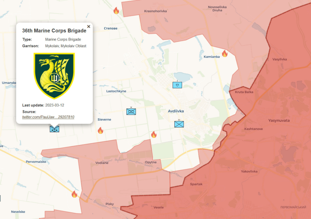 Au sud-ouest d’Avdiivka, les forces russes se sont déplacées vers le nord. Elles tentent actuellement de s’emparer de Siverne. Les premiers progrès ont été stoppés lorsque, le 12 mars, la 36e brigade de marine ukrainienne a été placée dans la région.