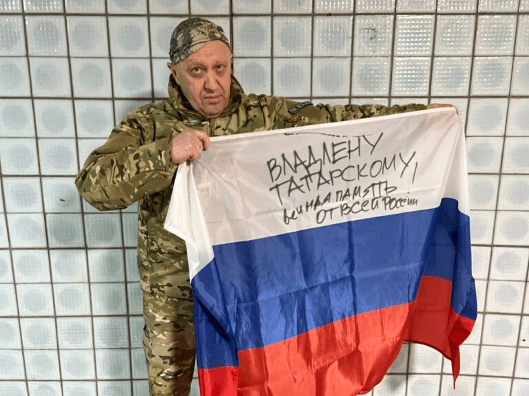 « 2 avril 2023, 23h00. Nous avons hissé le drapeau russe avec l’inscription « Mémoire éternelle de Vladlen Tatarsky » et le drapeau du PMC « Wagner » sur l’administration de la ville de Bakhmut. Légalement, Bakhmut est prise. L’ennemi est concentré dans les régions occidentales ». affirme M. Prigozhin dans la vidéo.