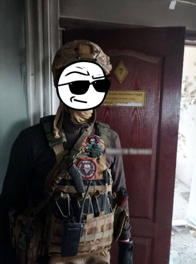 Le combattant Wagner dans le bâtiment du conseil du district d’Artemovsky :