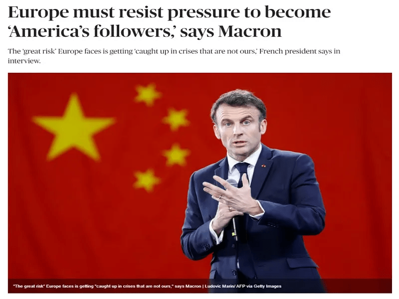 Politico a publié dimanche un article exclusif relatant la conversation de leurs journalistes avec le président français Macron lors de sa visite en Chine, au cours de laquelle il a parlé avec enthousiasme de son objectif de faire de l’Europe un acteur stratégiquement autonome dans les relations internationales. Pour preuve de ses intentions, il a fustigé l’idée selon laquelle l’Europe devrait suivre l’exemple des États-Unis en provoquant la Chine à propos de Taïwan, ce qui a suscité une vive condamnation de la part de nombreux commentateurs alignés sur les États-Unis à travers le continent.