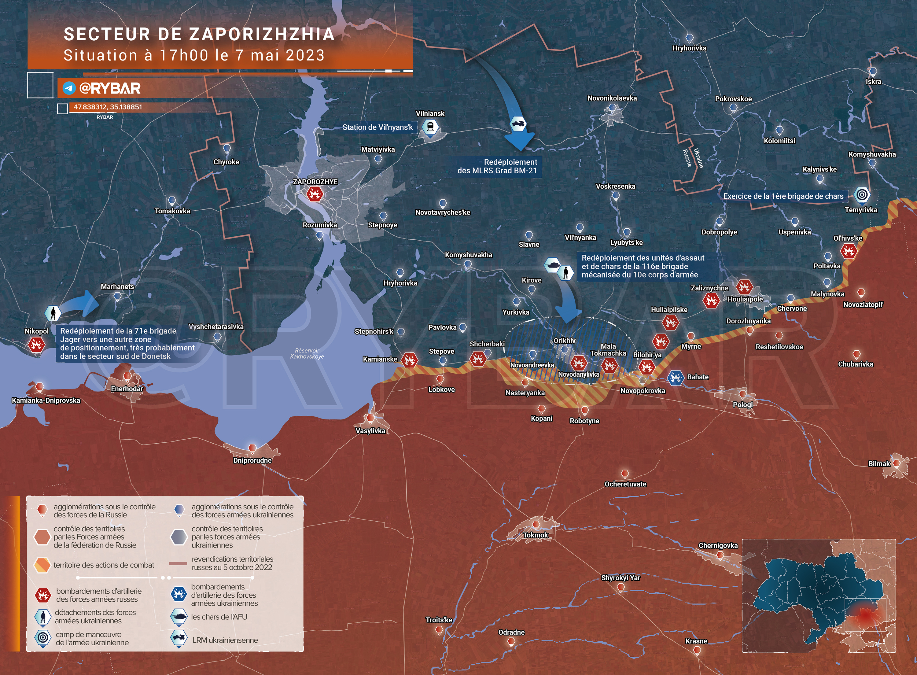 Les préparatifs d’une offensive se poursuivent dans la région de Zaporizhzhya. Des renforts sont acheminés vers la ligne de combat. L’autre jour, un convoi de 72 véhicules, dont 21 BMP Kirpi, six Humvees, un radar à roues AN/MPQ-36 basé sur un Humvee, des tracteurs et 13 camions ont traversé Dnepropetrovsk.
