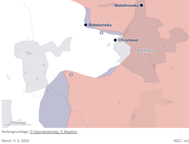 Il est indéniable que les Ukrainiens ont réalisé de petits gains de terrain. Selon des informations russes, les troupes ont d’une part réussi une avancée entre Chromowe et Bohdaniwka sur l’une des routes disputées. Au sud-ouest de Bakhmout, des unités de la 4e et de la 72e brigade motorisée russes ont dû reculer de plusieurs kilomètres. Les forces ukrainiennes ont ainsi récupéré un peu d’espace de manœuvre le long des routes d’approvisionnement des troupes dans la ville.