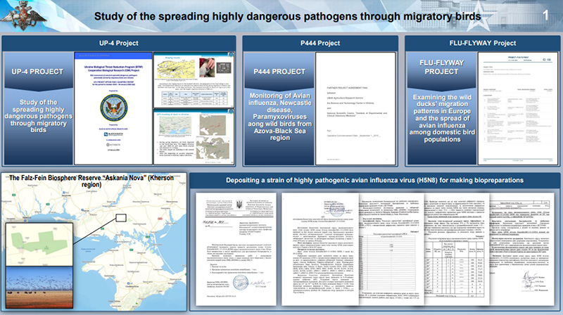 Les documents saisis dans le laboratoire vétérinaire de la réserve confirment l’implication de l’Institut de médecine vétérinaire de Kharkov dans les travaux des projets américains UP-8 et P-444 et dans les préparatifs du projet Flu-Fly-Way. Leur objectif était d’évaluer les circonstances dans lesquelles la transmission de maladies associées à des infections économiquement significatives peut devenir incontrôlable, entraîner des dommages économiques et constituer une menace pour la sécurité alimentaire.