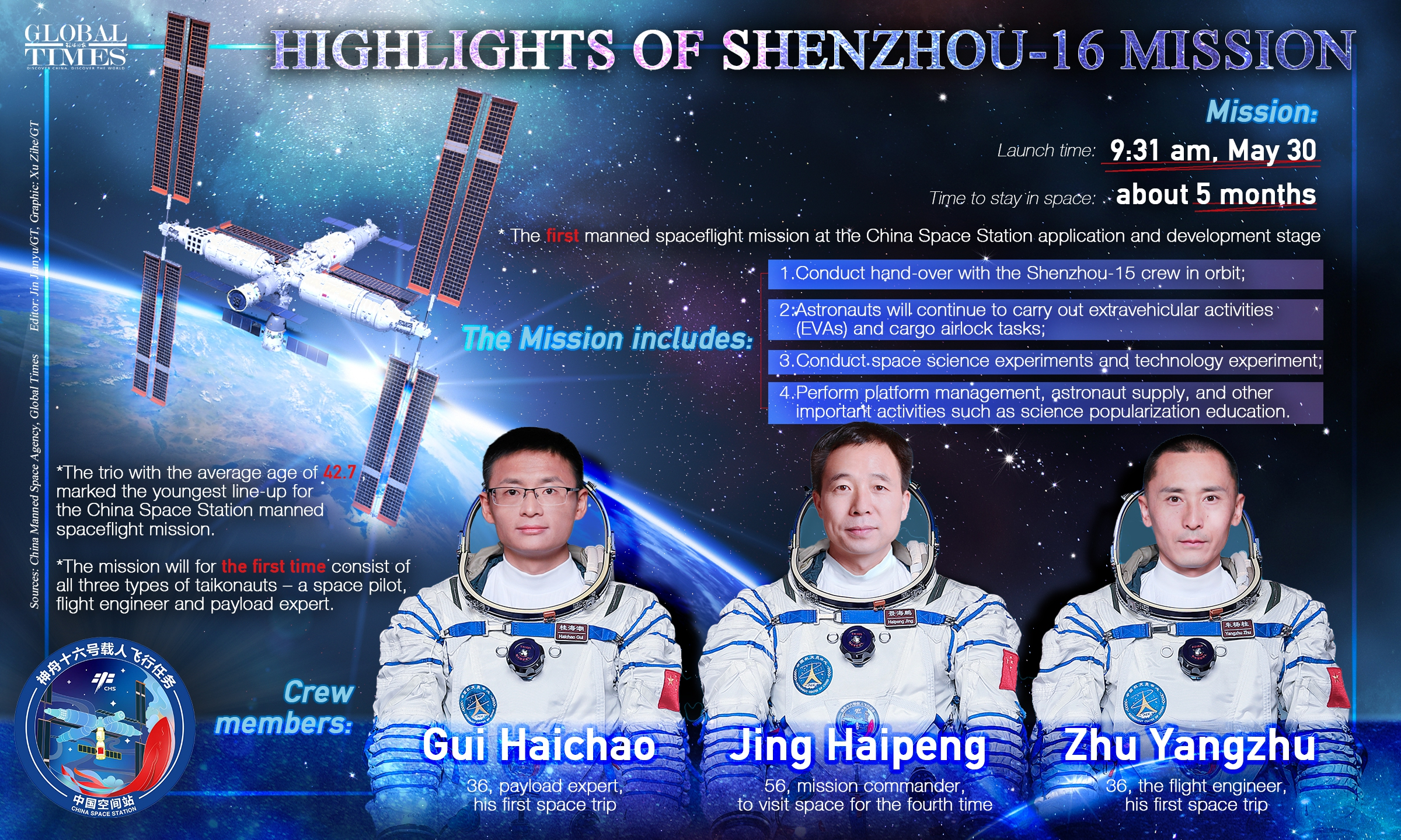 En ce qui concerne la composition de l’équipe, le Shenzhou-16 comprend pour la première fois un expert en charge utile, Gui Haichao, ainsi que l’ingénieur de vol Zhu Yangzhu, qui seront dirigés par le taïkonaute chevronné Jing Haipeng, dont c’est le quatrième voyage dans l’espace. Jing sera le commandant de la mission.