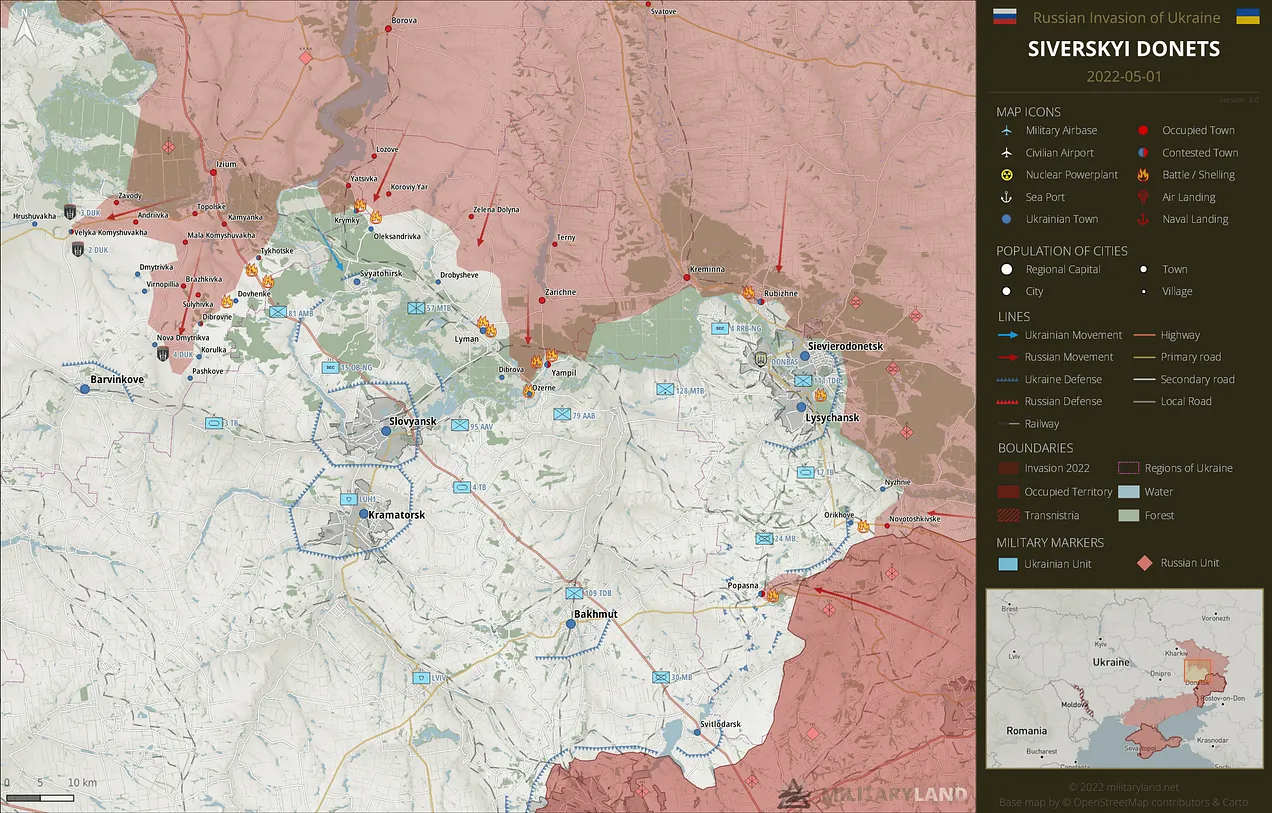 À titre de référence, voici à quoi ressemblait la ligne de front dans le centre du Donbas le 1er mai 2022, avec l’aimable autorisation de MilitaryLand :