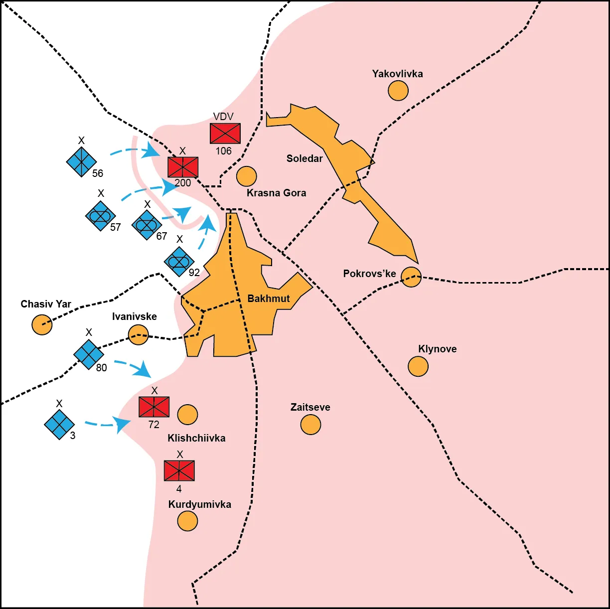 Un véritable encerclement n’a probablement jamais été envisageable, principalement en raison de la complication de Chasiv Yar, un bastion de l’arrière fermement tenu. Pour encercler complètement Bakhmout, les forces russes auraient été obligées de choisir entre deux options difficiles : soit bloquer la route de Chasiv Yar à Bakhmout, soit élargir l’enveloppement suffisamment pour inclure Chasiv Yar dans la poche également. L’une ou l’autre option aurait grandement compliqué l’opération, et Bakhmut n’a donc jamais été véritablement encerclée.