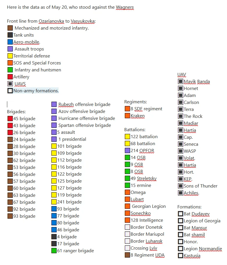 Tout d’abord, nous devons nous attaquer au fait incontestable qu’une grande partie de l’armée ukrainienne a été déployée à Bakhmut à un moment ou à un autre. La chaîne Telegram Grey Zone a dressé une liste de toutes les unités ukrainiennes qui ont été identifiées avec certitude (généralement par des messages sur les médias sociaux ou des mises à jour de l’AFU) comme étant déployées à Bakhmut tout au long des neuf mois de la bataille (c’est-à-dire qu’elles n’y étaient pas toutes en même temps) :