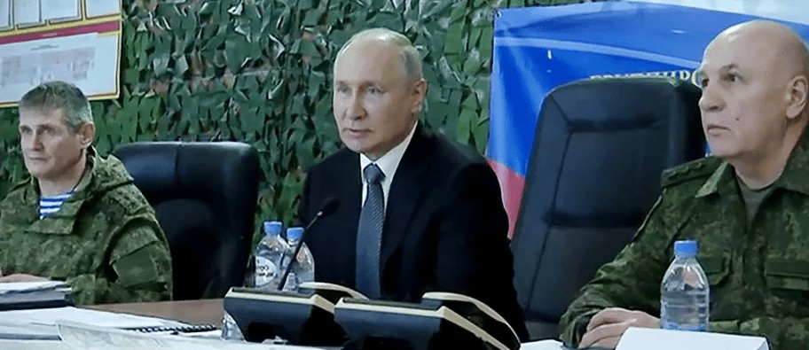 Le président Poutine lors d’une visite au quartier général du groupement tactique du Dniepr près du front de Kherson, le 18 avril. Tass a rapporté : « Lors de sa visite au quartier général du groupement tactique du Dniepr, près du front de Kherson, Vladimir Poutine a entendu les rapports du commandant des troupes aéroportées, le colonel général Mikhail Teplinsky [à gauche], du commandant du groupement tactique du Dniepr, le colonel général Oleg Makarevich [à droite], et d’autres commandants de terrain.