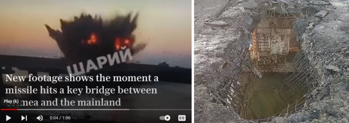 À gauche : explosion d’un missile à l’impact du pont de Chongarsky le 22 juin ; à droite, cratère d’impact sur la chaussée du pont. Source : https://www.dailymail.co.uk